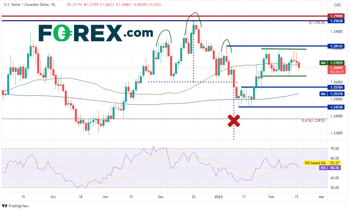 美元/加元日图于1月11日下破头肩顶形态的颈线1.2600并开始下探1.2250目标,但1月13日-1月20日期间出现的多个锤子形态阻碍了下探势头,帮助价格反转,至1.2797高点,也令头肩顶形态失效。自那以后,美元/加元一直交投于上文提到的区间内。