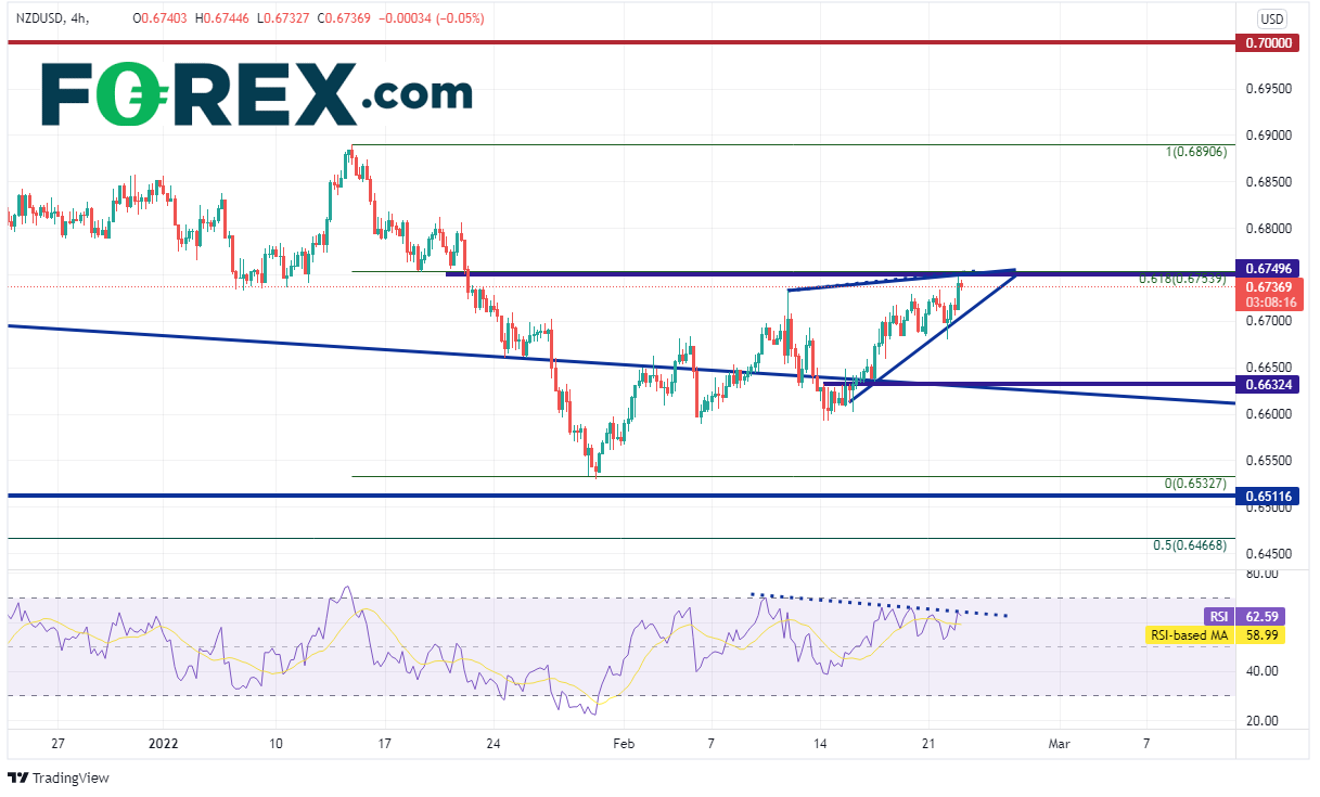 新西兰联储本周将召开会议,据预期加息25个基点,也不排除加息50个基点的可能性。如果到时候透露的立场温和程度弱于预期,纽元/美元可能回调。但美元走势眼下应该受制于俄乌危机相关消息。技术面请留意潜在的转折点位。