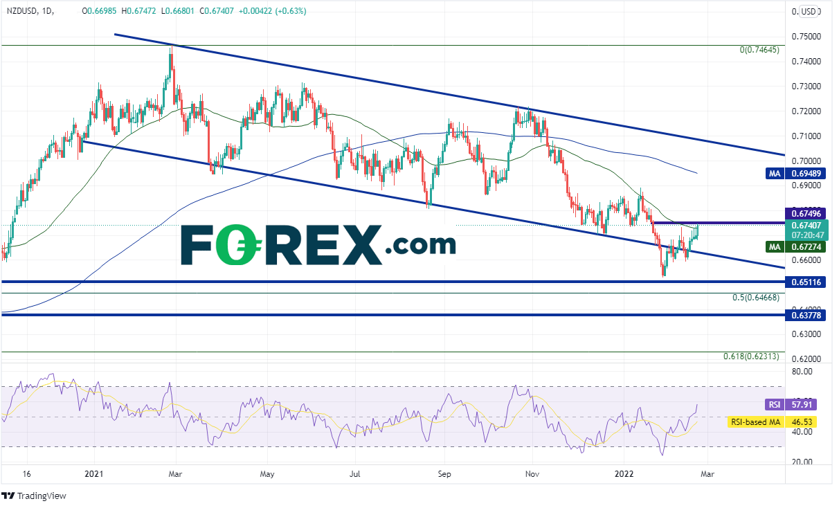 纽元/美元2021年年初以来一直交投于长达一年的下降通道内,今年1月底下破该通道的下轨趋势线,在0.6529创下短线低点后回到通道内,目前测试水平阻力位0.674950天均线0.6727附近。请注意,价格突破通道一端失败后常常回过头测试通道的另一端。