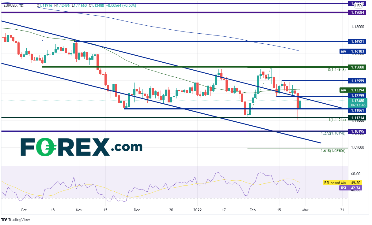 欧元/美元一直交投于长期下跌趋势内,但2021年11月10日以来基本受限于1.1120-1.1500区间。该货币对在俄罗斯侵入乌克兰事件的影响下,昨天先是考验横盘通道(请看下图绿色线)的下轨,之后反弹。投资者逃往美元避险,导致欧元/美元最低跌至1.1106。但若俄罗斯与乌克兰在3月16日FOMC会议之前达成和解,美元又将是另一番景象。下方支撑位有长期水平阻力位1.1020、1月28日低点到2月10日高点行情的127.2%扩展位、长期下跌通道的下轨趋势线1.0970附近。如果2月通胀在美联会议召开之前出现降温迹象,欧元/美元可望上涨。上方阻力有水平阻力位1.1280、50天均线1.1329和系列近期高点汇聚的1.1296、2月10日高点1.1500附近(该位也是心理整数大关)。