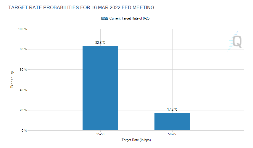 而美联信的通胀目标为2%,所以,上述数据几乎是对通胀处于“高位”的证明。美联储会在3月16日的会议上加息50个基点吗?圣路易斯联储主席几周前的讲话造成市场混乱。当时他表示,预计截至7月1日加息100个基点。按他的说法,美联储要在那个日期之前的其中一次会议上加息50个基点,或者临时加息。之后市场慢慢平静下来,但美联储官员Waller和Bowman昨天的讲话再度搅动市场。Waller表示,基准利率目标应当在夏初达到1.00% - 1.25%区间,美联储应该在不晚于7月会议开始收缩其资产负债表。Bowman指出,高涨的通胀可能促使美联储加快加息的步伐,速度应该高于之前加息周期的速度。此番言论也催生加息50个基点的期待。CME的Fedwatch工具显示,市场目前只计入17%的几率3月加息50个基点。(月初的时候这个几率接近100%)。加息50个基点的几率可能已经因为俄乌局势动荡而下降,这点应该引起我们的注意。