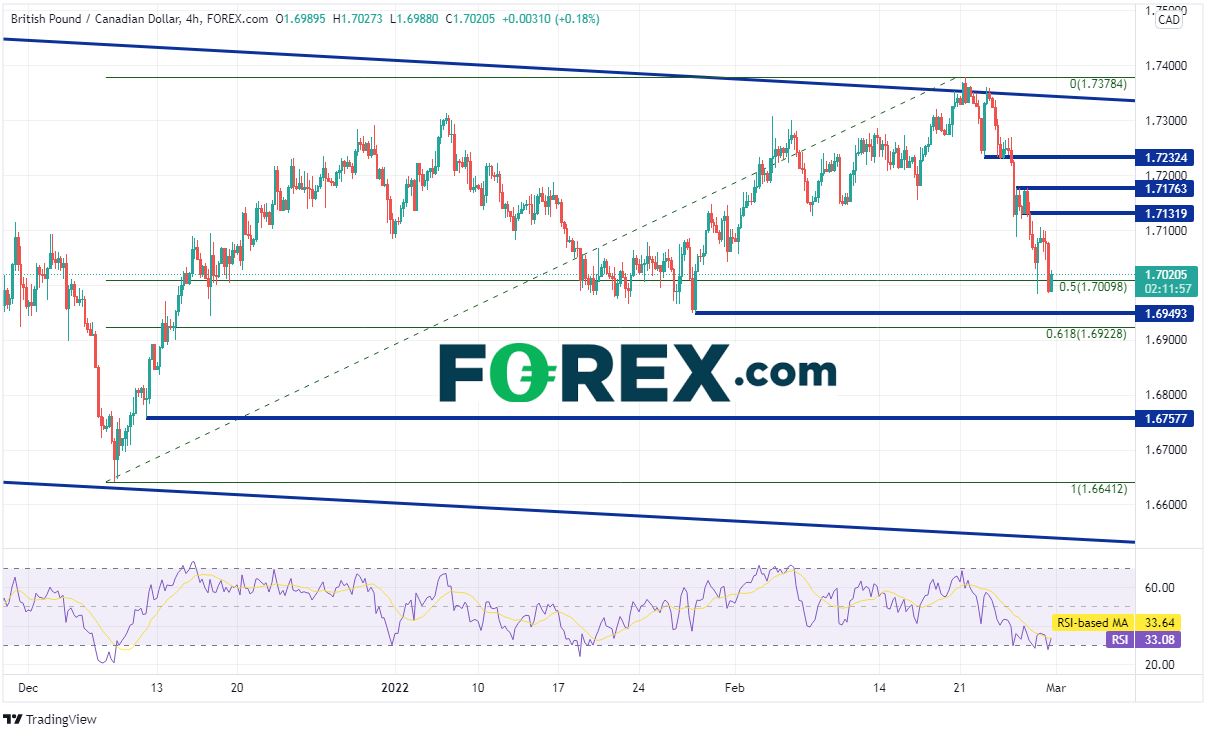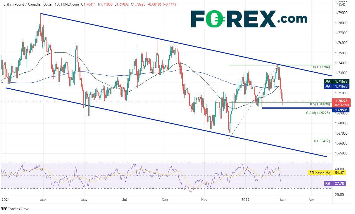 20212月底以来英镑/加元一直交投于下降通道内,后来在距今较近的128日击穿1.6641附近的通道下轨趋势线,形成锤子形态后于今年221日回升至通道顶部1.7378。该货币对此后回吐前述区间的一半涨幅并在周一考验1.7000的心理整数支撑位。