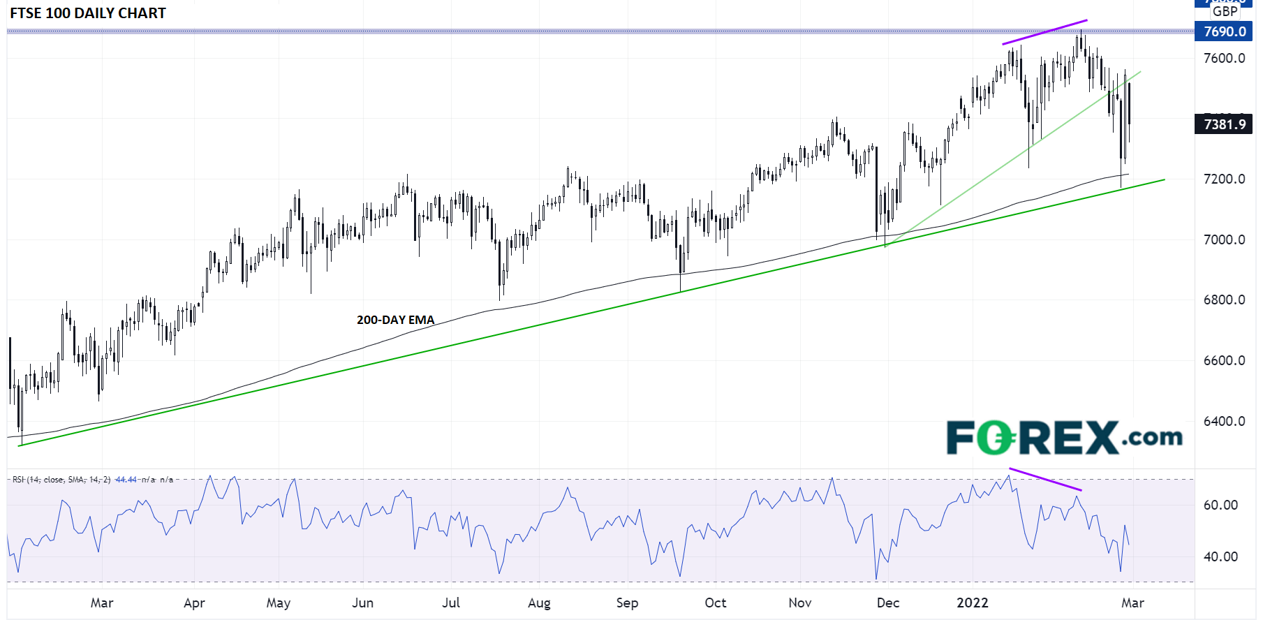 如果FTSE100指数确实屈服于整体避险环境,那么由200天指数移动均线和上升趋势线组成的7200区间将是至关重要的价位。FTSE100指数过去13个月里四次守住该区间并反弹,而且2020年11月以来从未收于其200天指数移动均线下方。所以,如果下破,可能意味着长期上涨趋势出现重大变故。