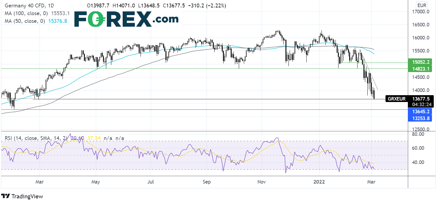 DAX今天跌至20212月低点13650,此文发稿时守住了支撑位。但如果失守,股指可能跌至2021年低点13250