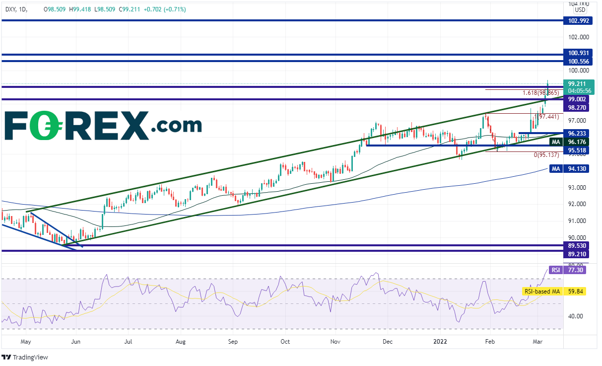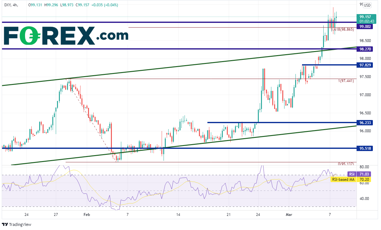 美元指数拥有继续上涨的充分动能,比如避险理由、通胀上涨或技术面因素。但交易者必须留意消息面。如果俄乌冲突在外交层面取得突破并且双方最终停火(或者周四发布的CPI数据低于预期),可能推低美元指数。