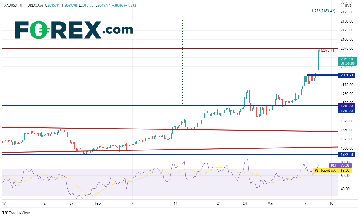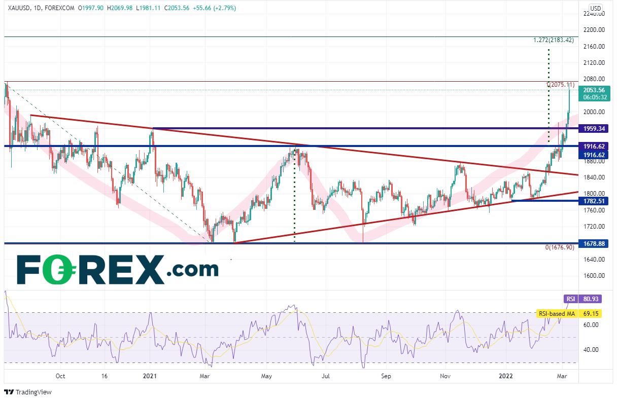 自从20208月创下历史高点以来,黄金(现货黄金/美元)一直交投于对称三角形内。该贵金属在2021年夏季于1678.88附近构筑双底后开始走高,211日站上三角形上轨趋势线,那是美国宣布俄罗斯可能随时侵入乌克兰的前一天。金价在2月底击穿双底颈线,随后一飞冲天。双底形态的目标在2153附近,但首先必须清除历史高点2075的障碍。请注意,日图RSI超买,表明金价可能准备回撤。