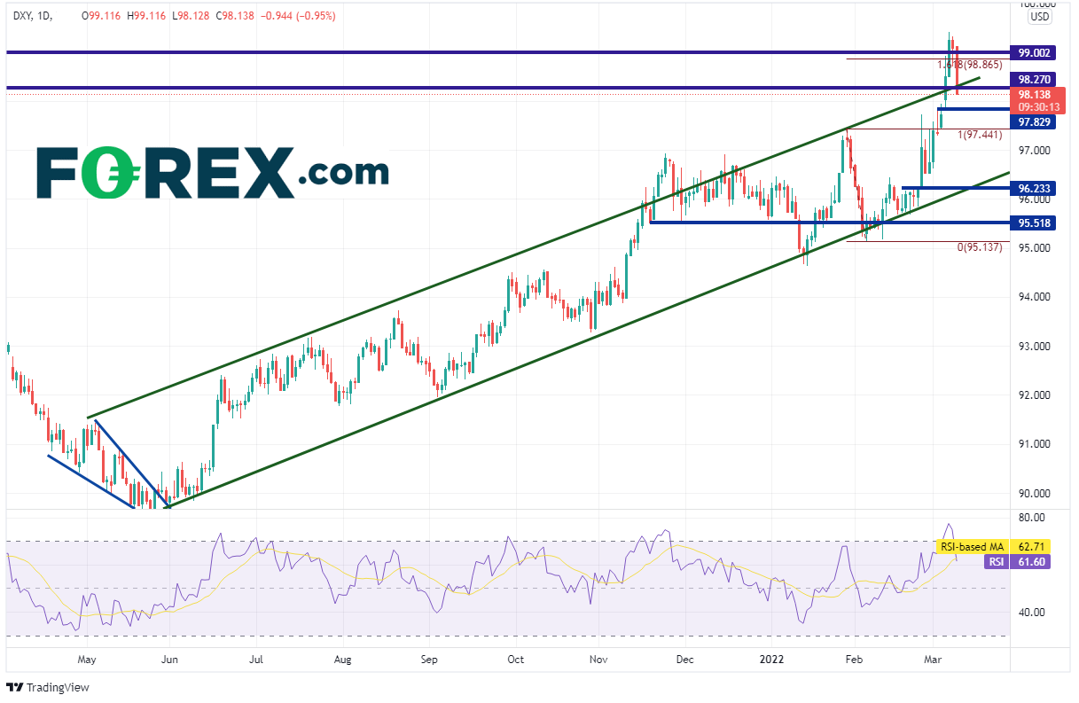 俄罗斯与乌克兰之间的战争出现结束的一线希望,美元因此将自创下20205月最高点以来的近期涨幅回吐一部分。美元指数周一测试了20215月以来的上斜通道的上轨趋势线、水平阻力位与128日高点到24日低点行情的161.8%扩展位后触及盘中高点99.42RSI同样处于超买区域。美元指数今天迄今下跌近1%,回到长期通道内部。