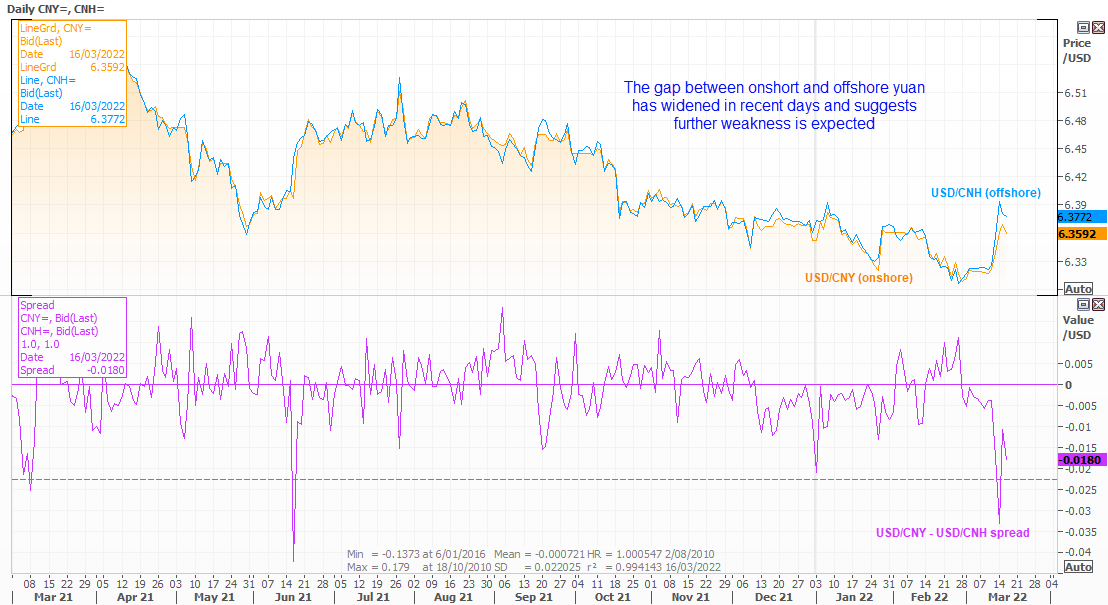 而如果美联储强硬式加息,美元/离岸人民币本周低点或已就位,后市第一步上看6.4200并且暂时受制于该潜在中枢价位。如果攻克6.4240,可能打开上攻6.500的空间。到时我们将扩大视野,观察2月低点是否确实数月低点。