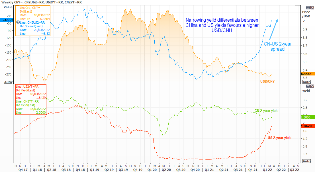 上图蓝色线条表示MSCI中国成长指数的年率百分比变化,并前移3个月,应可作为美元/离岸人民币的领先指标。该指数在2021年上半年筑底,此后领先于美元/离岸人民币加速上扬。鉴于美联储现进入积极加息周期,中美2年期债券收益率已收缩至20212月以来最低点。所以我们有理由认为,美元/离岸人民币后市上涨可期。