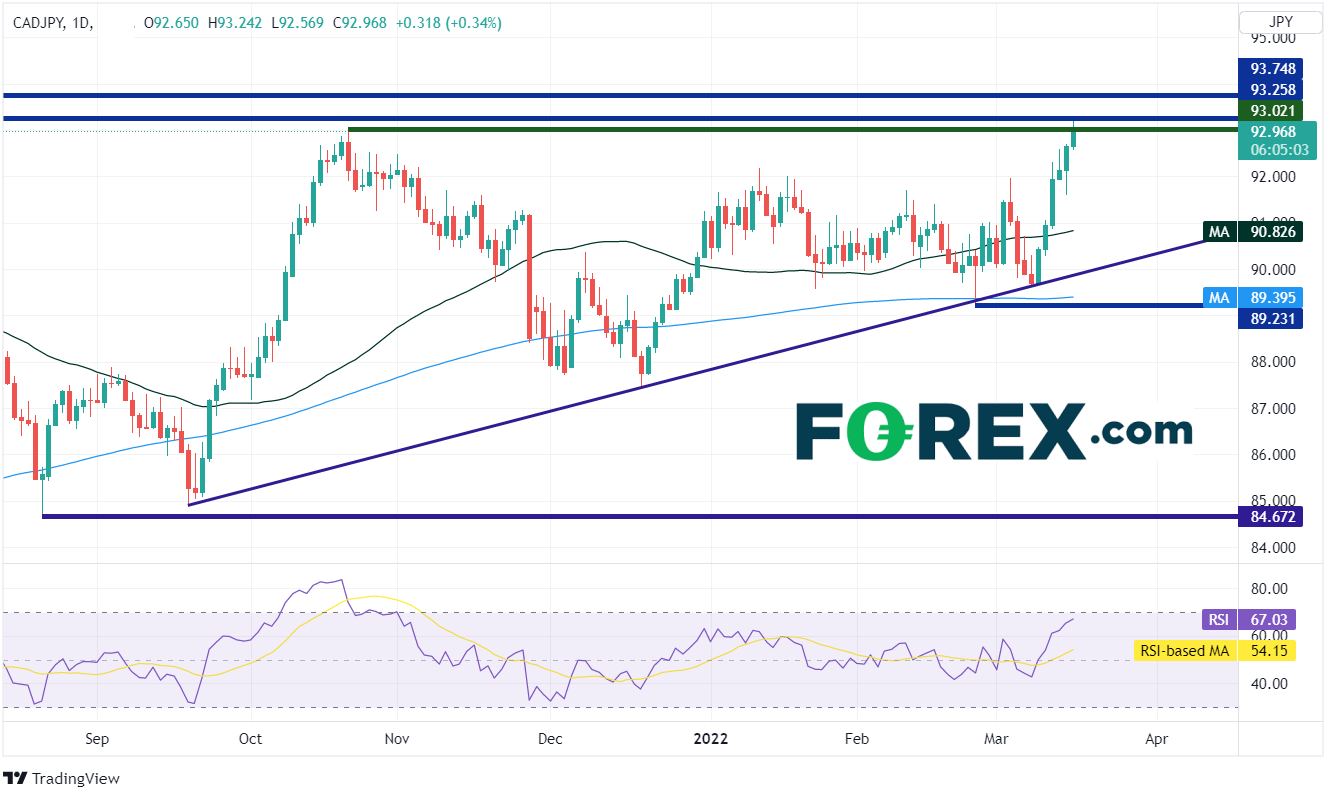 但请注意,RSI目前与价格背离,暗示价格可能准备回撤。第一支撑位在水平支撑92.59,然后是3月3日以来高点91.97,接着是3月8日低点91.59和水平支撑位90.71。