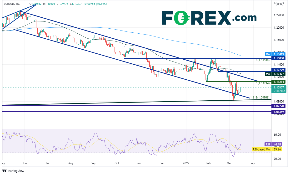 欧元/美元日图有序走低并形成下降通道。2月时一度突破通道但以失败告终,回到通道后考验通道下轨,但止步于128日低点到210日高点行情的161.8%扩展位,即1.0920附近。预计当前下跌趋势不改,但有空间在通道内先行上涨。上方阻力在310日高点兼前低点1.1121附近,然后是通道的上轨下降趋势线1.1210附近。支撑位在通道下轨趋势线1.0890附近,然后是37日低点1.0806
