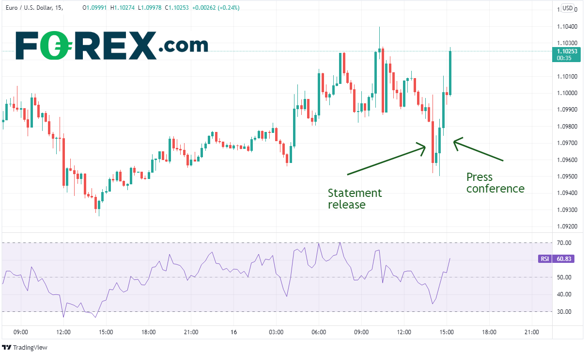 FOMC声明发布与新闻发布会召开前后,欧元/美元的走势极度震荡,原因可能是“见声明沽出、等新闻发布会买进”的行为所致。欧元/美元在1.1000上方不远处构筑高点,在新闻发布会召开前下探1.0950,在发布会之后调头向上回到FOMC声明公布前的高点。