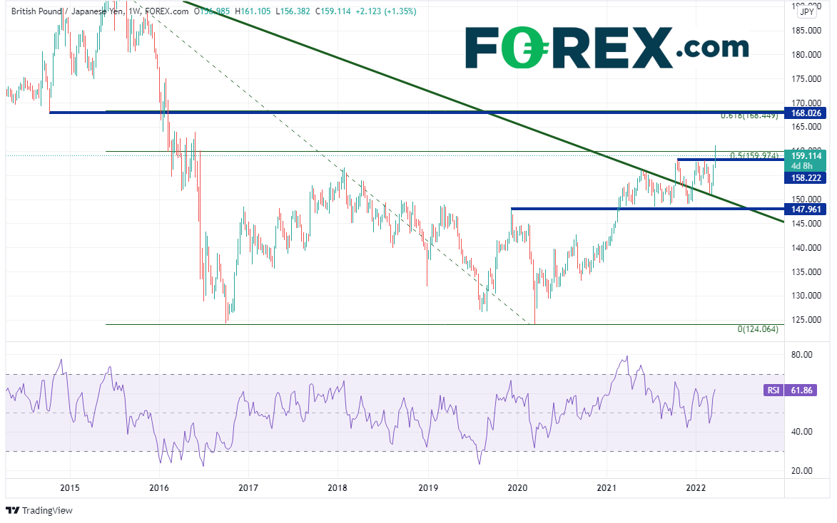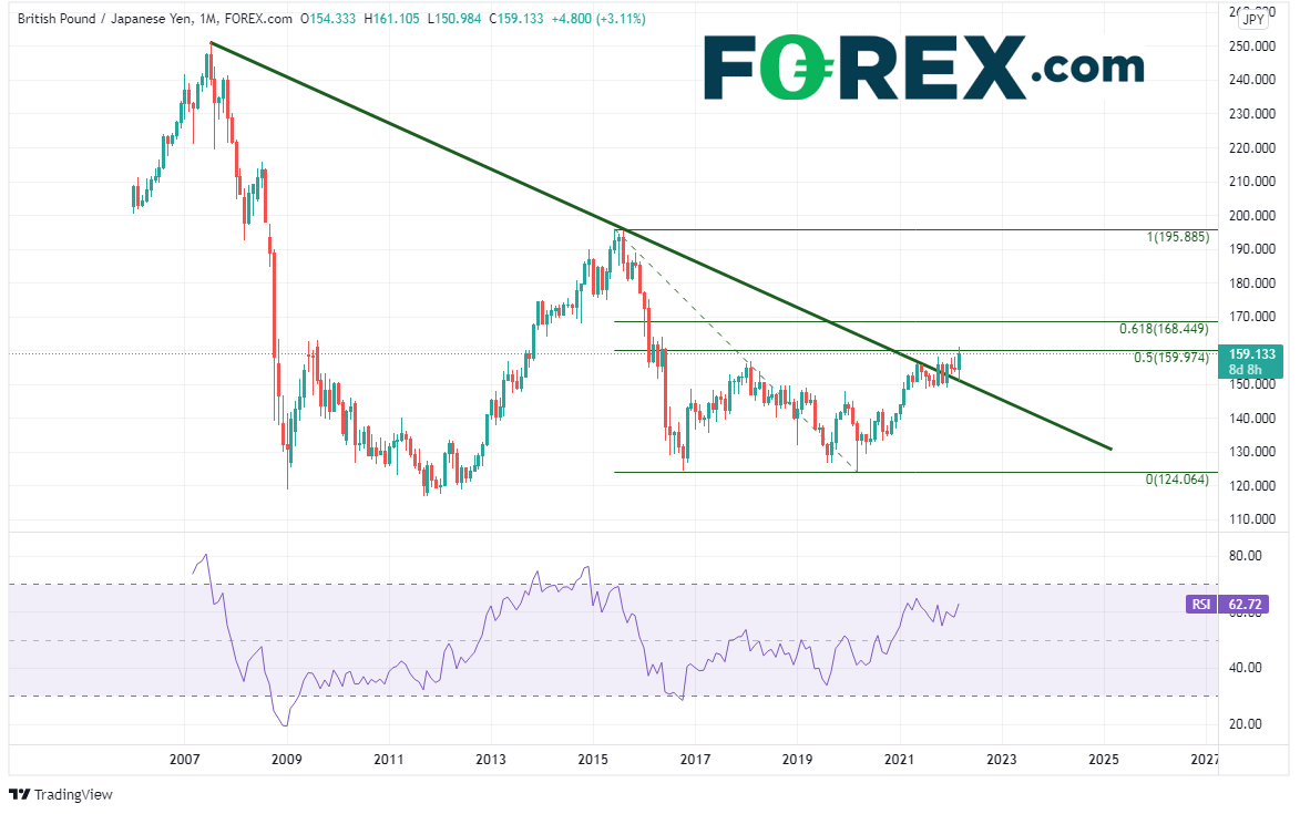 英镑/日元月图最近站上2007年7月以来的长期下降趋势线,目前测试2015年6月高点到2020年3月低点行情的50%回档位,即159.97附近。