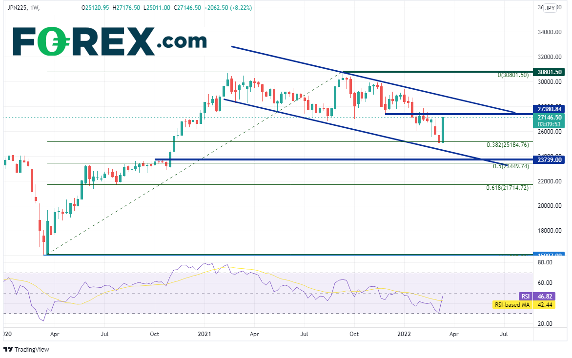 日经225指数上周上涨8.25%,斩获2020年3月以来最大涨幅。该大盘股指自2020年3月低点15997开始上涨,于2021年2月16日当周创下30724高点。经过回撤后于2021年9月测试前述高点并在30801.5形成略微上抬的新高。自那以后,该股指下跌并形成下降通道,考验了2020年3月低点到2021年9月高点行情的38.2%回档位,即25136.8附近,然后在上周强力回升。上方阻力有略高于当前价位的水平阻力位27380附近,然后是下降通道的上轨趋势线28800附近,接着是30801.5高点。支撑位在2周前以来低点24497,那也是前述通道的下轨趋势线,然后是由前高点和前述行情的50%回档位形成的支撑区间23459-23739,接着是61.8%回档位21714附近。