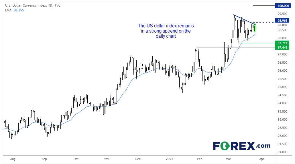 虽然3月大部分时候横盘震荡,美元指数日图仍处于强劲的上涨趋势中,20天指数移动均线不断提供支撑力量,而97.712的双底是一个上抬的低点。周五的K线可能是看涨锤子形态,表明该回档线下方存在买需。我们现在期待站上98.965后发出重拾涨势的信号,目标为100,期间目标可能在99.42高点。