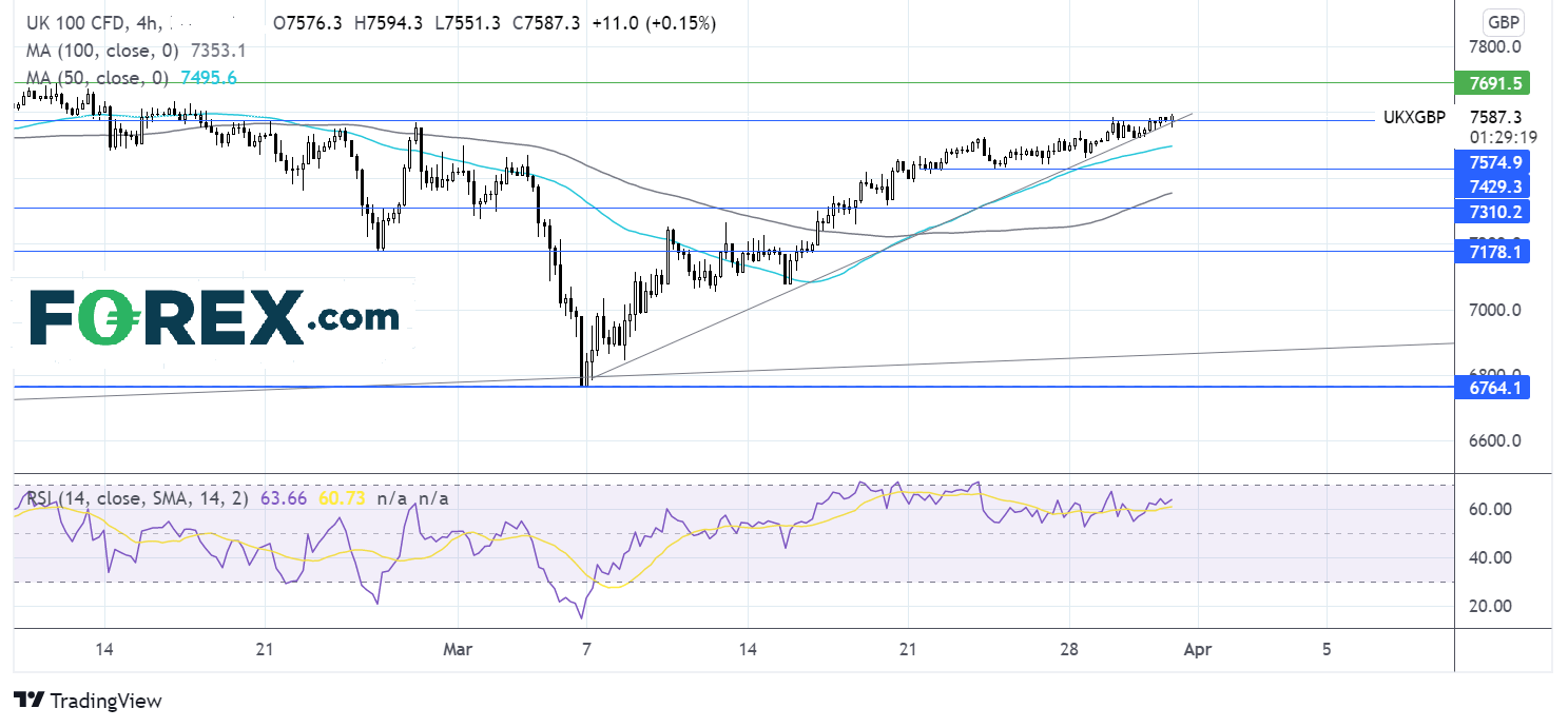 FTSE已将2022年低点6750以来的反弹扩大,目前交投于月初以来的上升趋势线并测试7580附近的阻力位,该位在过去半年里数次构成阻力。RSI留在超买区域之外,支持价格扩大上行。如果价格上破,可能上看疫情后期高点7690