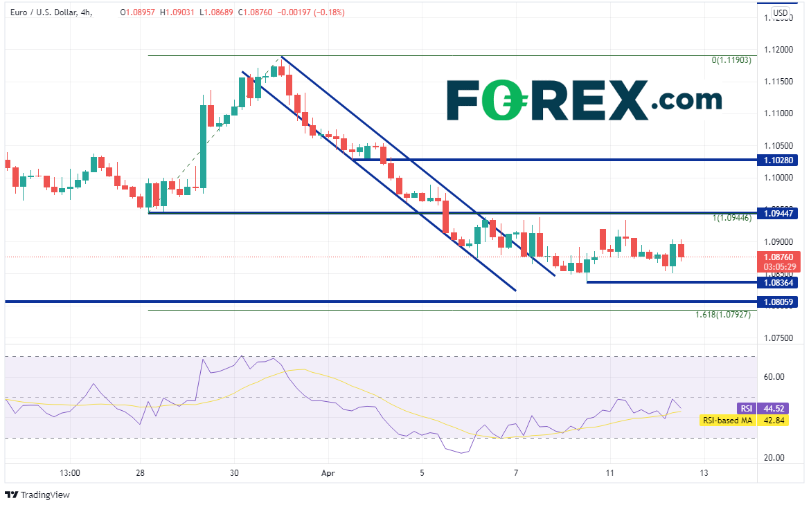 欧元/美元的走势一直和美元指数走势相似,只是方向相反。3月31日以来价格一直有序走弱并形成下跌通道,之后横盘并摆脱通道。但欧元/美元今天没有像美元指数那样创下短线新低。第一支撑位在4月8日以来低点1.0836附近,然后是3月7日以来低点1.0806,接着是3月28日低点到3月31日高点行情的161.8%扩展位1.0792附近。阻力位先后落在3月28日低点1.0945附近、水平阻力位1.1028和3月31日高点1.1190。