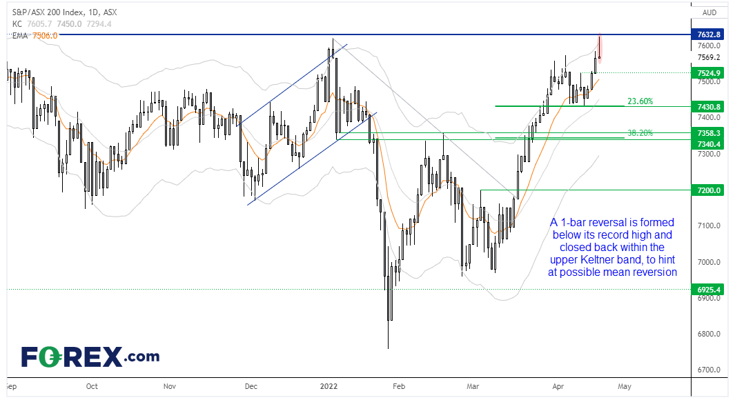 ASX200指数昨天涨至距离历史高点不到10点的水平,但未能守住涨幅,当天基本收平,形成看跌pinbar。这是由1K线组成的看跌反转形态,而且形成于历史高点下方,另价格收于Keltner上轨下方,我们怀疑具备了自当前价位回归均值的基础。空头第一目标可能在7525高点或10天指数移动均线附近的7500。如果我们看到格外汹涌的抛盘,价格可能跌至7430.8。但在那之前我们将寻找在7500附近构筑波段低点的证据。