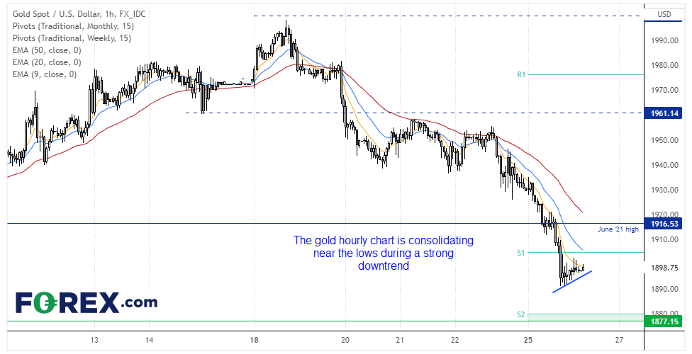 我们可以看到黄金小时图依然处于强下跌趋势中,但在低点上方不远处的小型看跌旗形盘整形态中。价格后市可能向下突破,该形态可能演变成三角旗/小型三角形。但我们更愿在小级别反弹时逢高沽出,或在创下新的低点时入场,目标1880,在周图第2枢轴支撑位附近。