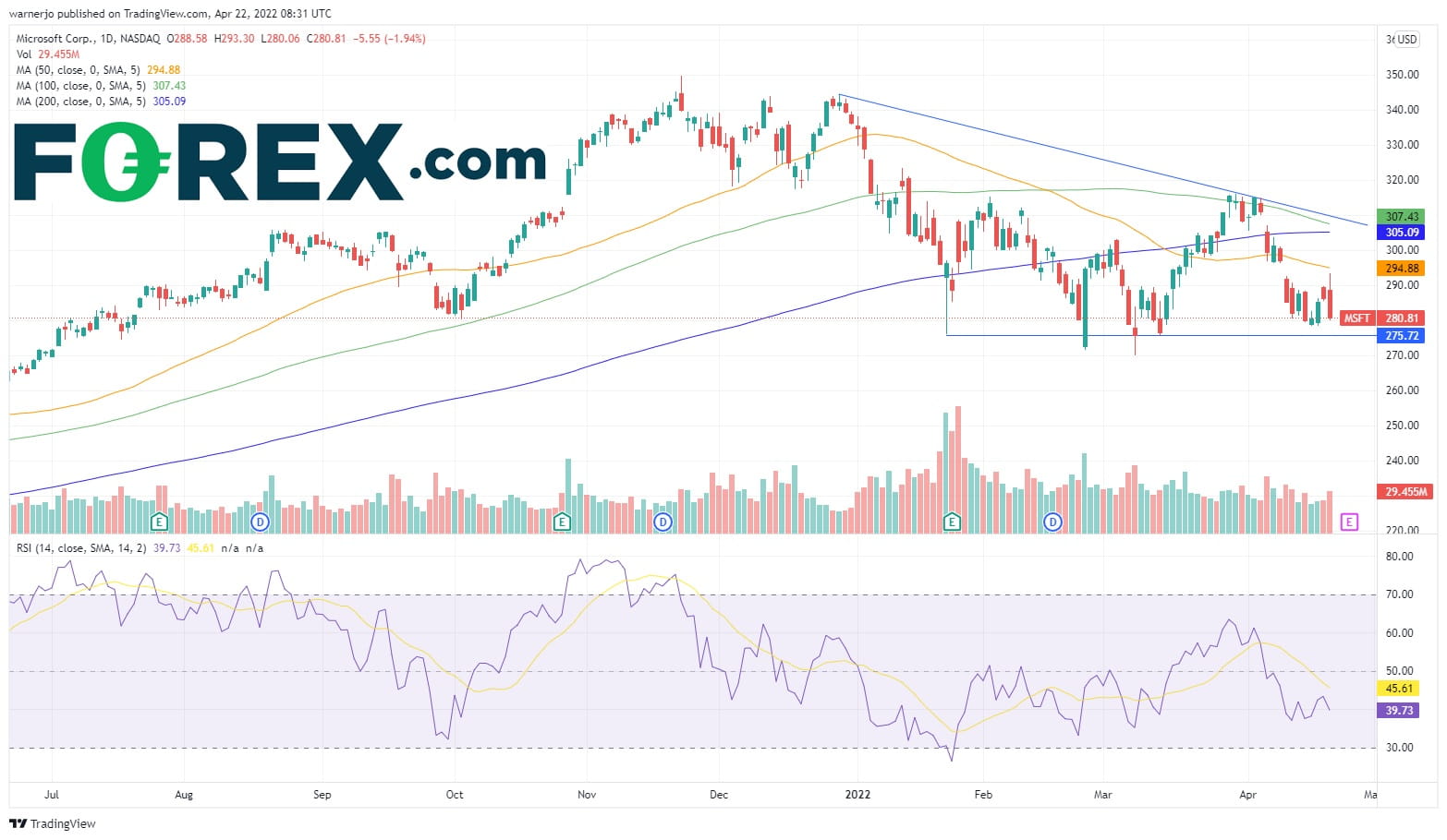 该股自2022年初以来一直处于下跌趋势中,构筑一系列高点和低点降低,但随着股价于280美元上轮下跌低点上方构筑底部,信心有所回升。