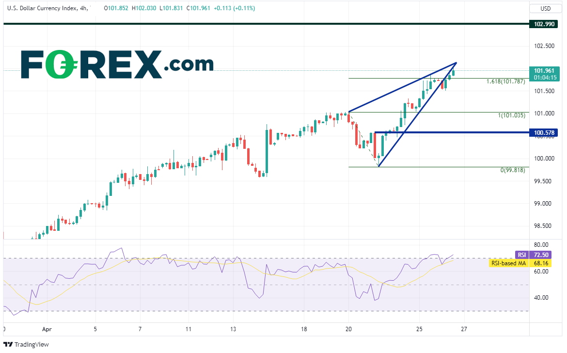 美元指数4小时图交投于4月20日高点到4月21日低点行情的161.8%扩展位附近,也下破了上升楔形,目前考验楔形的下轨趋势线。第一阻力在楔形顶端102.13附近,然后是2020年3月高点102.99。请注意,4小时图RSI同样处于超买区域,增加了短线回撤的几率。第一支撑位在今天低点101.51,然后是水平支撑位101.04和100.58。