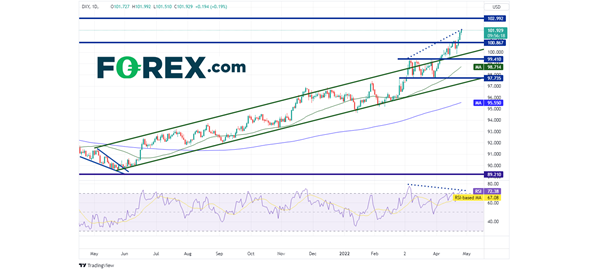 2021年5月,当美联储暗示可能准备开始量化紧缩,美元指数也随之启动涨势。去年一整年,伴随着通胀的飚升,美元指数亦如是。美元指数从5月25日开始自89.53低点有序上涨,形成上升通道,直至打破通道上轨,今天创下高点102.07。美元指数4月5日以来大举上攻的主要原因有二:1)加息较之前预期激进的传言;2) 中国因疫情扩散而实施封锁管控,先是上海市,接下来可能是北京市。美元指数现在似乎挟威势上攻2020年3月以来高点102.99,但请注意,价格与RSI背离,表明美元指数短线或准备回撤。