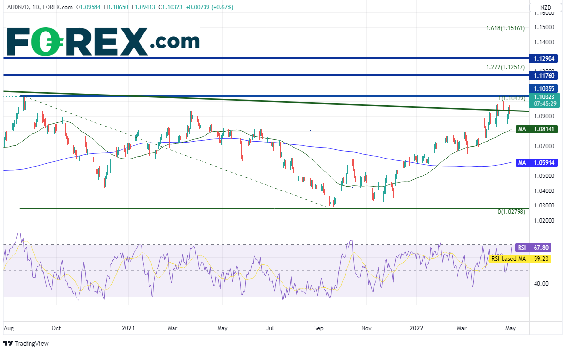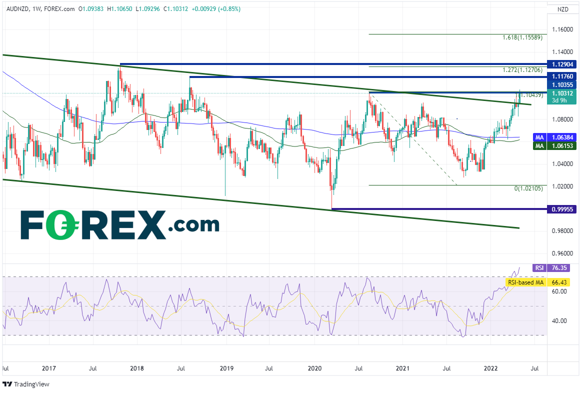 该货币对周图自201310月以来有序下跌,形成下降通道(请看绿色线条)。过去几周测试了通道的上轨趋势线所在的1.0925附近,今天在澳洲联储决议的刺激下暴涨并攻克通道上轨趋势线,还突破了水平阻力位1.0439,创下20188月以来最高点。但请注意,RSI正处于超买区域,表明价格长线或准备回撤。