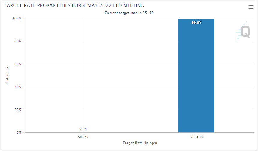 根据CMEFedWatch工具,交易员绝大多数(超过99%)计入上调基准利率50个基点,进入0.75%-1.00%区间。那将是2000年以来首个幅度为50个基点的加息。