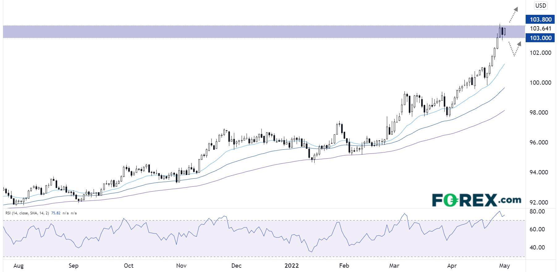 接下来看美元指数日图。这个全球储备货币正在测试近20年高点所在的103.00-103.80阻力带。14RSI指标显示价格明显超买,如果美联储的立场不如部分分析师预期得强硬,短线有可能回撤。但多头可能选择在下探100.00-101.00区间时逢低买入,如果(或在美联储会议刺激下或在本月晚些时候)站上103.80,则有望打开上涨空间,夏末或持续上攻105.00甚至更高的水平。