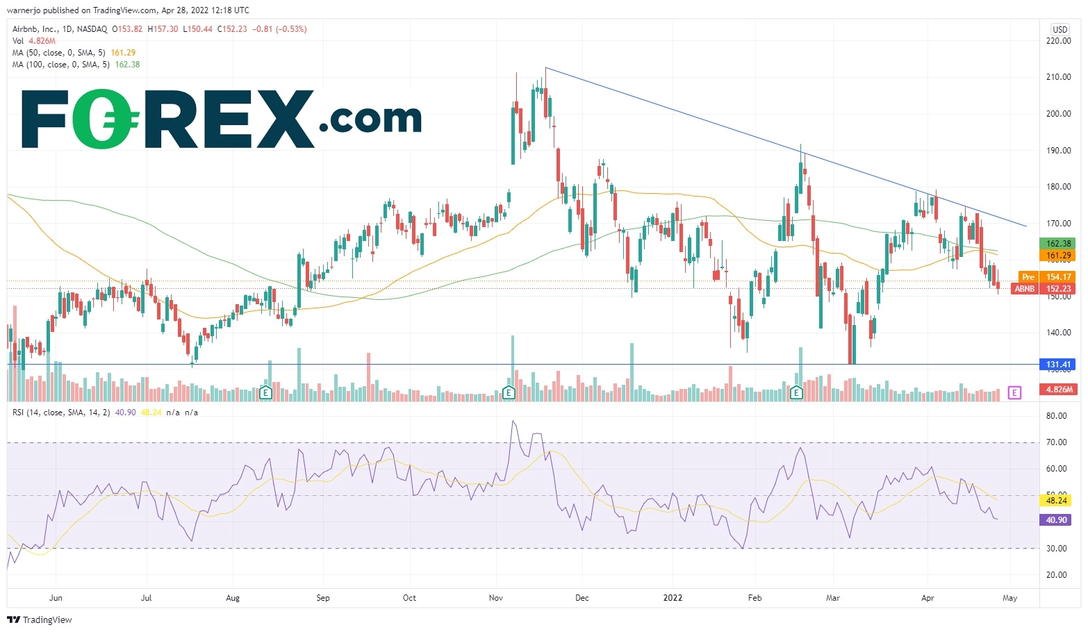 只有守住131美元才能发出打破跌势的信号,不过要巩固信号,还需要看到股价大幅上行并构筑高点抬高,从而避免楔形成形。这就需要价格守住161美元50天均线,162美元100天均线,然后才有望攻入170上方目标。若落实,将为上穿186美元开路。值得注意的是,覆盖爱彼迎的40家券商认为该公司股票在未来12个月可上涨30%以上,平均目标价198美元。