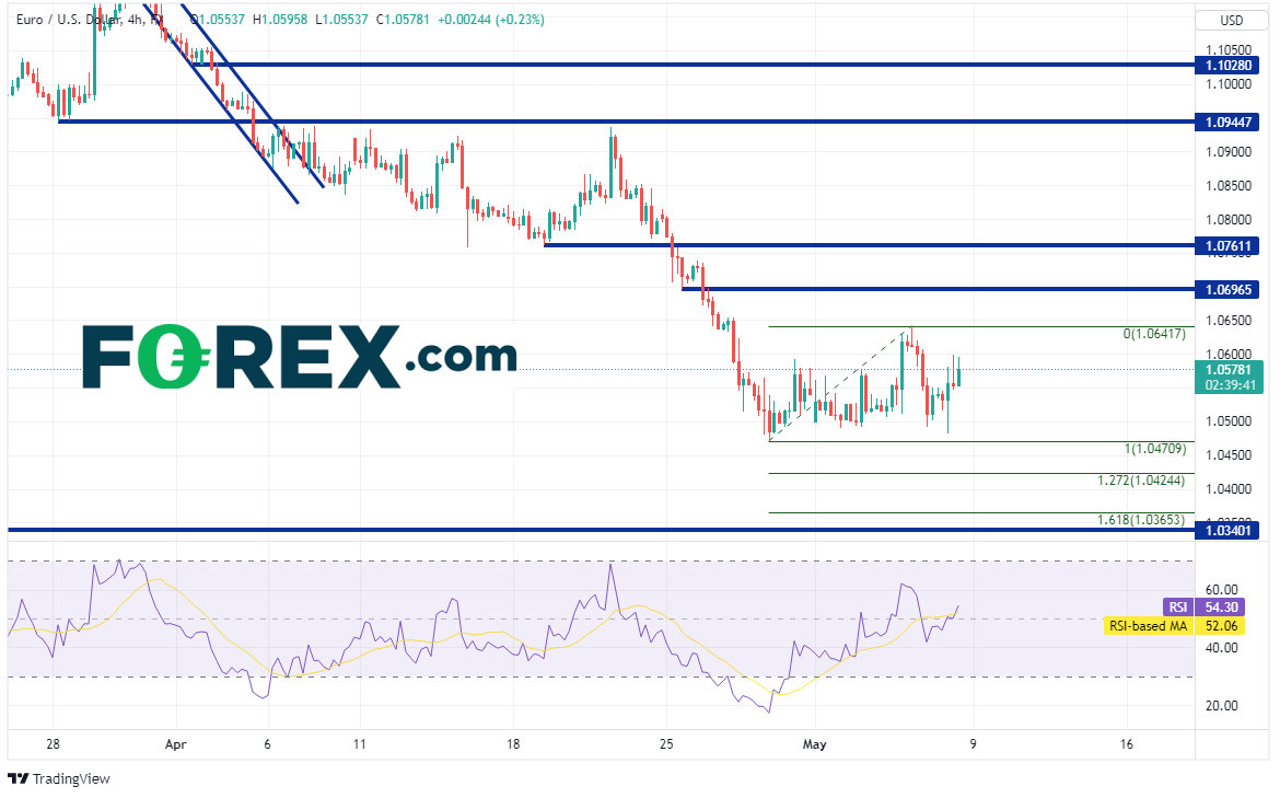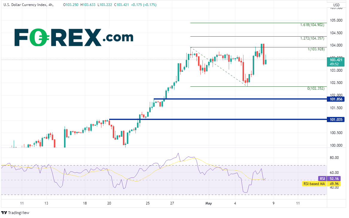 美元指数4小时图仍交投于今天高点附近,上方有4月28日高点到5月5日低点行情的127.2%扩展位1.0435、前述行情的161.8%扩展位1.0490附近、2002年9月以来水平阻力位1.0541(请看日图)。如果价格回撤,第一支撑位在5月5日低点1.0235,然后是水平支撑位101.86和101.03。