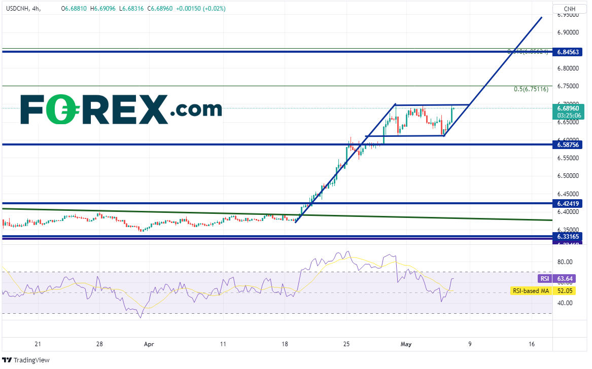 中国的封锁管控举措致使制造业与服务业数据弱于预期,还会带来更多不利的结果吗?受此拖累,人民币下跌,而离岸美元/人民币大涨。周期较短的图表显示,该货币对正在旗形内盘整,而周期较长的图表显示RSI超买。如果价格继续区间横盘,周期较长图表上RSI可能缓解超买状态,为价格走向旗形目标,即6.9400附近创造条件。