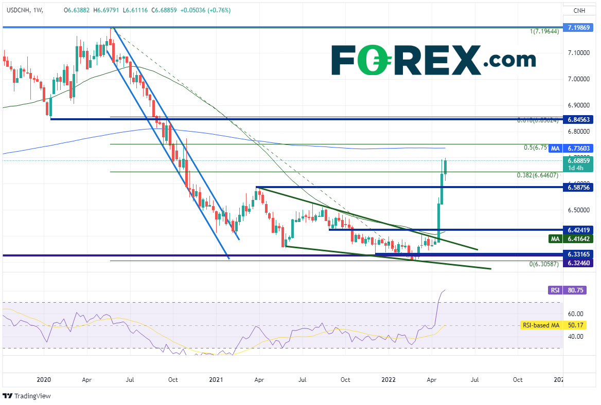 离岸美元/人民币在2020年5月25日于7.1987形成高点后有序下跌,于2021年2月最低到达6.400附近后脱离通道开始横盘整理,而从2021年5月到2022年4月18日长达一年的时间里,该货币对形成了下降楔形。该形态突破后的目标为形态100%回档位。随着站上上轨下降趋势线,离岸美元/人民币开始大举上攻,仅用了两周就到达目标,还站上2020年5月高点到2022年2月低点行情的38.2%回档位,即6.6461附近。价格在今天创下2020年11月以来最高点6.6979。请注意周图RSI超买,表明价格或准备回撤。