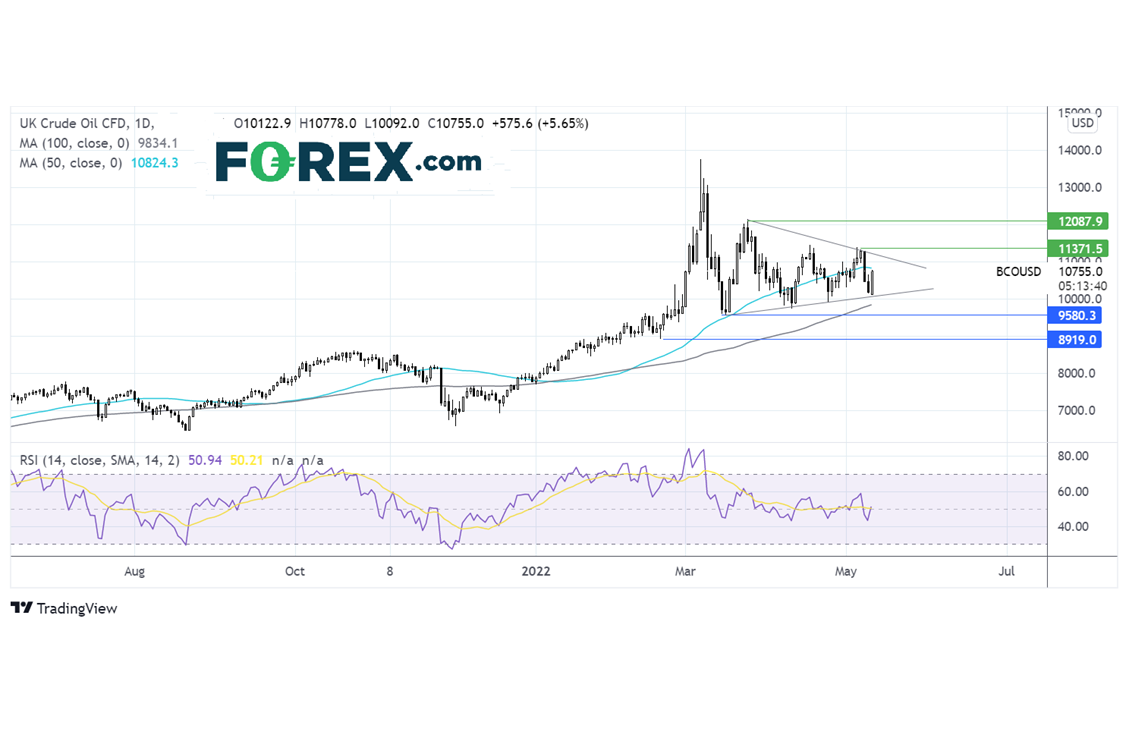 自去年底以来油价不断上扬,最高到达128.20。油价此后回落但仍高于其上升趋势线和100期均线,目前价格盘整,RSI也处于中性区域。