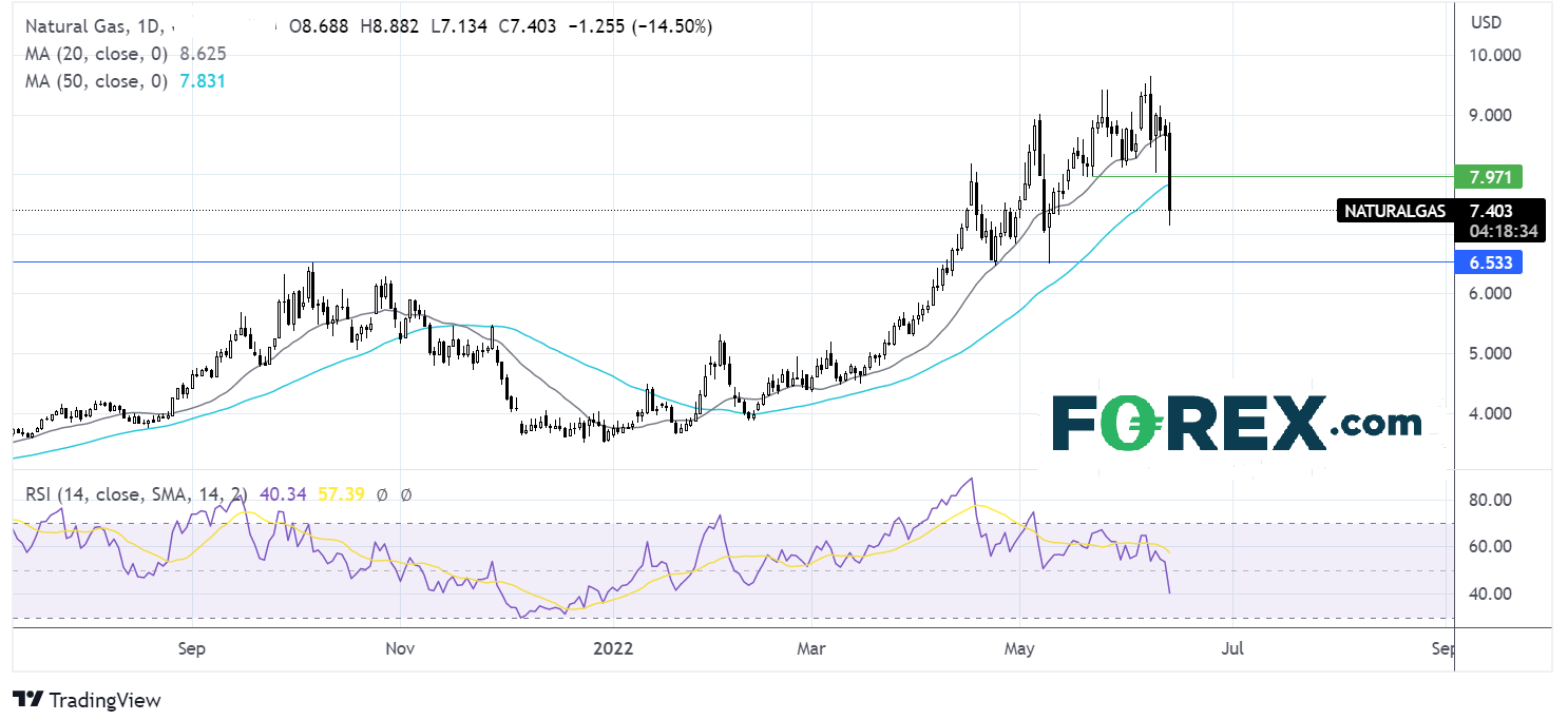 天然气价格业已暴跌14%,击穿了2050期均线,后于7.134遇阻。这是天然气价格1月底以来首度跌破50期均线,叠加RSI看跌,后市或扩大下行。