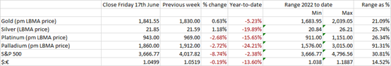 与此同时,COMEX 614日当周(当时金价自1850跌至1818)主动型基金持有的黄金头寸锐减。多头裸持仓在4月中旬高达514吨,当周骤降,上周二为339吨,降幅达到34%;空头裸持仓同期增加75吨,增幅50%,达到225吨。以上,现在净头寸为115吨,是202110月以来最低点,是前12个月均值的56%。当期白银多头裸持仓小幅增加,但空头裸持仓跃升850吨(16%),净多头因此为1609吨。银价跌幅因此和平常一样远大于黄金跌幅,从22.28美元跌至21.05美元,跌幅6%。相比之下,黄金跌幅为2%。自那以后,白银同样获得部分逢低买盘,无疑也有更多的空头回补。白银在22遇阻,黄金回到1840。二者5月中旬以来实际上一直横向窄幅波动,上档压力沉重。金价上档都面临短期均线的阻力,而且基本面一定程度支持上涨,但或许需要奋力挣扎才能实现。好的一面是,黄金一直在其10天均线上方窄幅交投,只是1873下方压力重重。