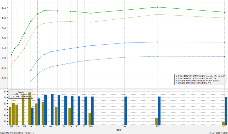 上周股市暴跌。当时美国联邦公开市场委员会提前加息,而欧洲央行在6月常规会议刚过去一周就召开了一次紧急会议。标普500指数暴跌近9%,欧洲市场同样下跌但表现好一些。除了瑞士股市跌幅高达4%之外,欧洲股市的普遍跌幅在2.0%-2.5%之间。事实上,股市的跌势始于前一周,原因是美联储加息75个基点的可能性越来越大,市场越来越焦虑。