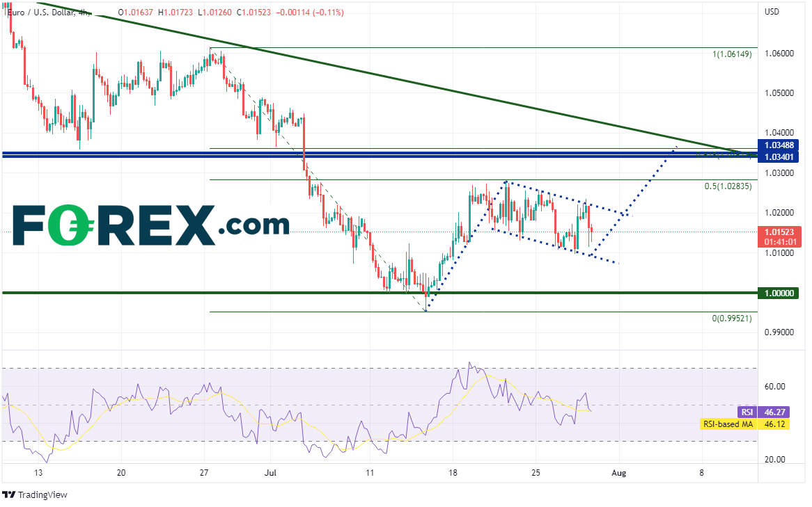 欧元/美元4小时图触及6月27日高点到7月14日低点行情的50%回档位1.0285,目前似乎在构筑旗形形态。第一阻力位在旗形上轨下降趋势线1.0215附近,攻克则可望摸至7月21日以来高点兼50%回档位1.0283。下个阻力位是由强水平阻力、前述行情的61.8%回档位和旗形目标构成的阻力带1.0340/1.3050。但如果价格下破,第一步可能下看旗形底部1.0085附近,然后下探7月14日低点0.9952。