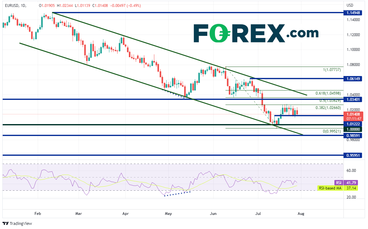 美元从昨天FOMC会议之后开始下跌。当时FOMC指出,“支出与产出指标近期走弱”,美联储未来将在每次会议召开时具体问题具体分析。今天的GDP数据发布后,美元再度开始下行。市场正在衡量定于8月发布的7月经济数据变弱的可能性。FOMC下次会议要到9月才会召开。交易者因此关注今后加息步伐放慢的前景,从而引爆冒险情绪。