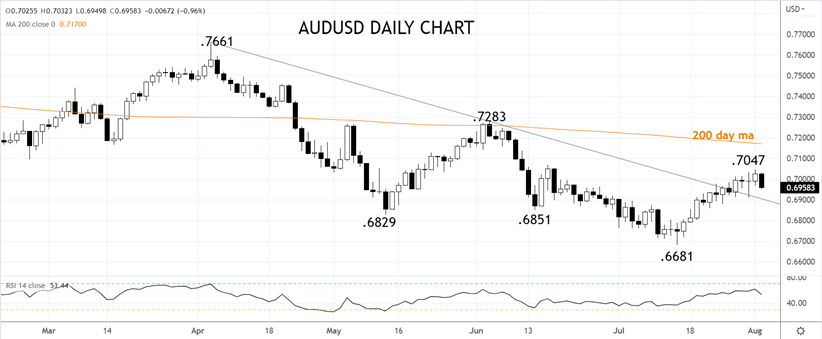 澳洲联储决议公布之后,澳元/美元自0.7050下跌至0.6950,可能扩大下行,目标0. 6900/80支撑。