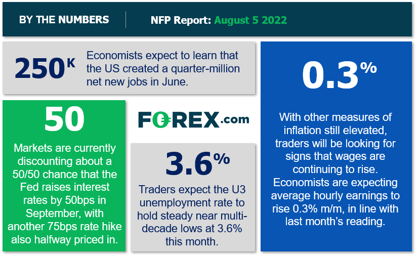 我们在上个月的非农就业前瞻报告中指出,美国就业市场“仍在持续、稳定地创造新的就业岗位,雇主竞相提供有竞争力的薪资,吸引人才。美联储在这样的背景下致力于快速紧缩银根,以保证通胀不会在与薪资螺旋式上升中互相纠缠,变得难以根除”。这句话一定程度上仍然是正确的,但我们要指出,交易员与经济学家目前预期美国就业增长速度显著下降:对于7月非农就业报告的主流预期值是,仅新增25万,而平均每小时收入月率增长0.3%
