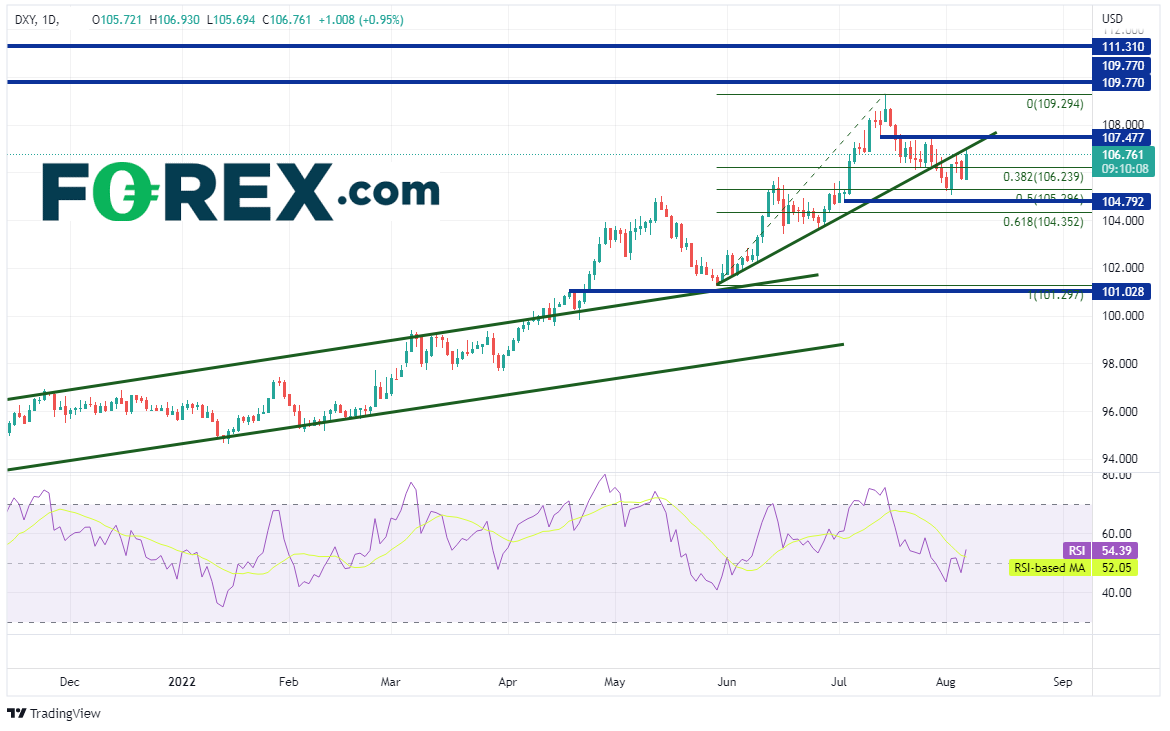 美元指数日图从2021年5月开始不断上涨,美联储将加快升息步伐的事实越来越清晰,助其在4月14日站上通道后强力上行。美元指数于7月14日创下数年高点后回落至5月30日低点到7月14日高点行情的50%回档位,即105.30附近,目前逼近上升趋势线107.00附近,如果可以站于其上,可能先后上看水平阻力位107.48和7月14日高点109.29。如果收上106.51,则上周五的K线将成为看涨吞噬K线,预示后市扩大上行。如果受制于阻力位,第一步可能下看8月2日低点105.05附近,然后下探104.79支撑位,再跌至前述行情的61.8%回档位。