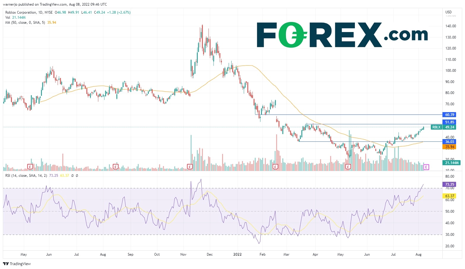 但鉴于近期涨势推动RSI进入了超买区域,52可能难以攻克。如果抛压重现,股价可能迅速下探36,其于今年数次构成支撑,也是50天均线所在。值得注意的是,21家经纪商给出Roblox的平均目标股价为38.50,暗示当前价格高估了22%。如果下破,可能近两个月首次跌至30以下。