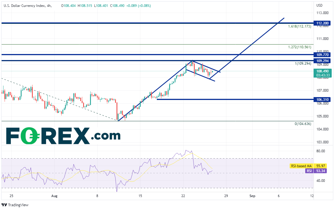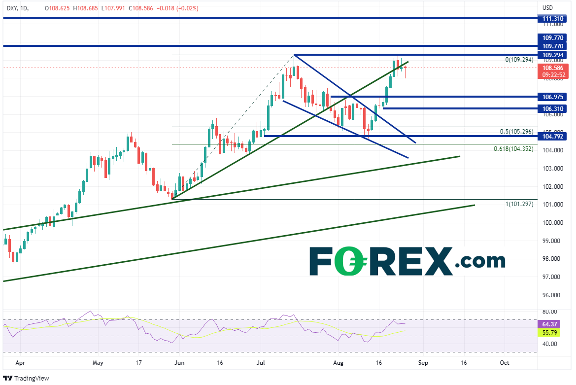 美元指数自从414日站上上升通道100.00附近以来大举冲高,530日回踩了趋势线后在714日摸至20年高点109.29。之后,价格回撤并形成下降楔形,最低跌至水平支撑位,就在530日低点到714日高点行情的50%回档位下方不远处的104.65。两天后,美元指数打破106附近的下降趋势线且自此再未回头。价格在周二测试了714日高点并守于其下,一直交投于近期水平附近,等待鲍威尔讲话。
