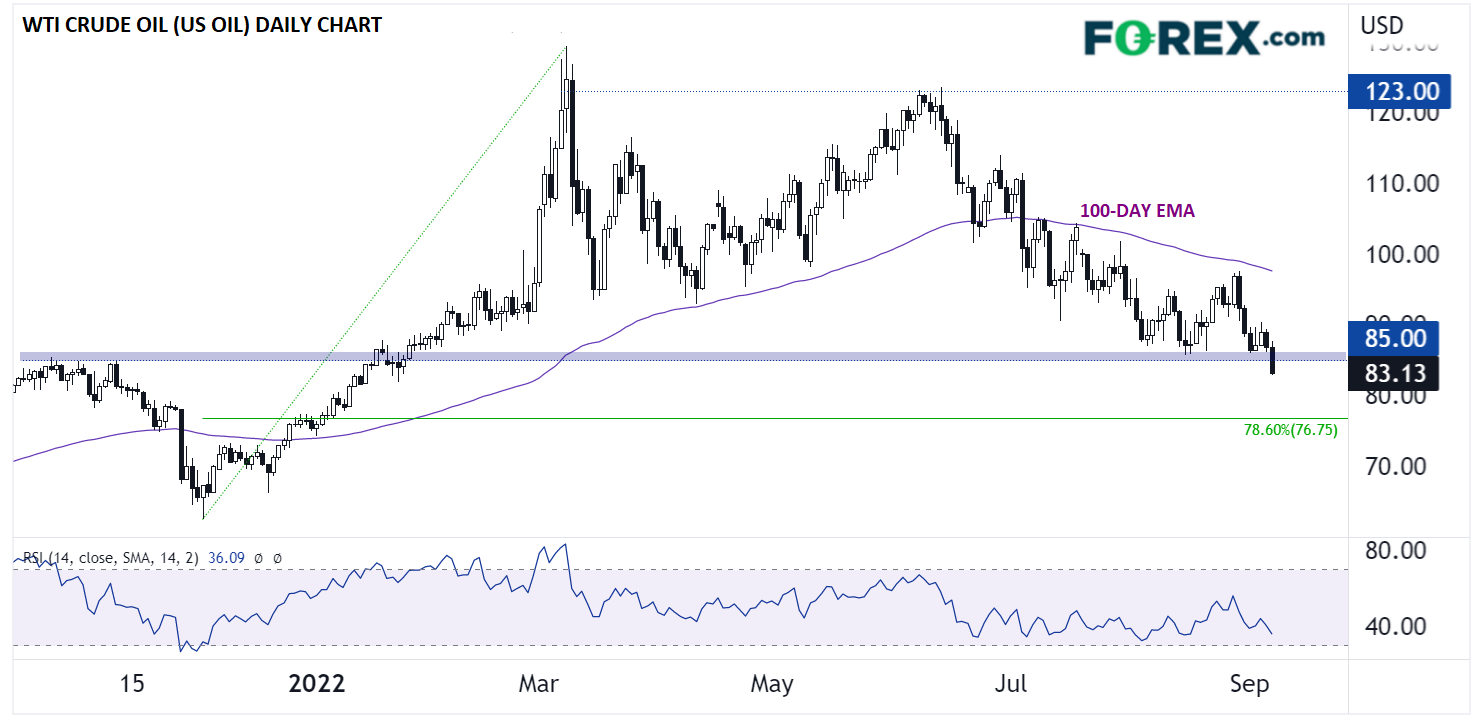 如上所述,油价下破85.00支撑位,跌至近8个月最低点。油价在其下降的100天指数移动均线下方形成系列明显下降的高点和低点,表明过去几个月趋势明显向下。但即使价格创下新低,14天RSI并未进入超卖区域,表明价格或许还有下行空间,然后技术抛压才可能有所缓和。