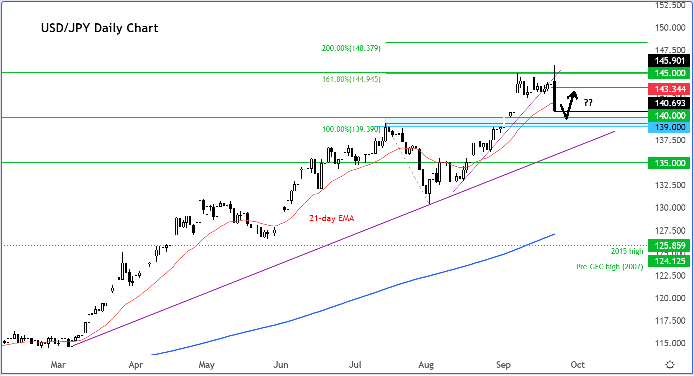 美元/日元一度在日本央行宣布保持政策不变后到达145.90高位,但之后在日本政府干预日元贬值势头的消息作用下暴跌至140.70。这是20世纪90年代末期以来日本政府首次干预外汇市场。现在的关键问题在于,在央行与政府存在分歧的情况下,政府干预有效吗?可以强力支撑起日元吗?