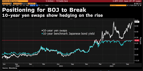 以上图表由彭博社的Valerie Tytel分享。她警告称,收益率曲线控制(YCC)失效是不能忽视的可能性。这是因为10年期日元互换已经开始显著上升,超过10年期日本国债收益率0.25%的门槛。这表明投资者正通过做空日本国债来对冲他们的押注,因为他们担心YCC可能会被弃用。