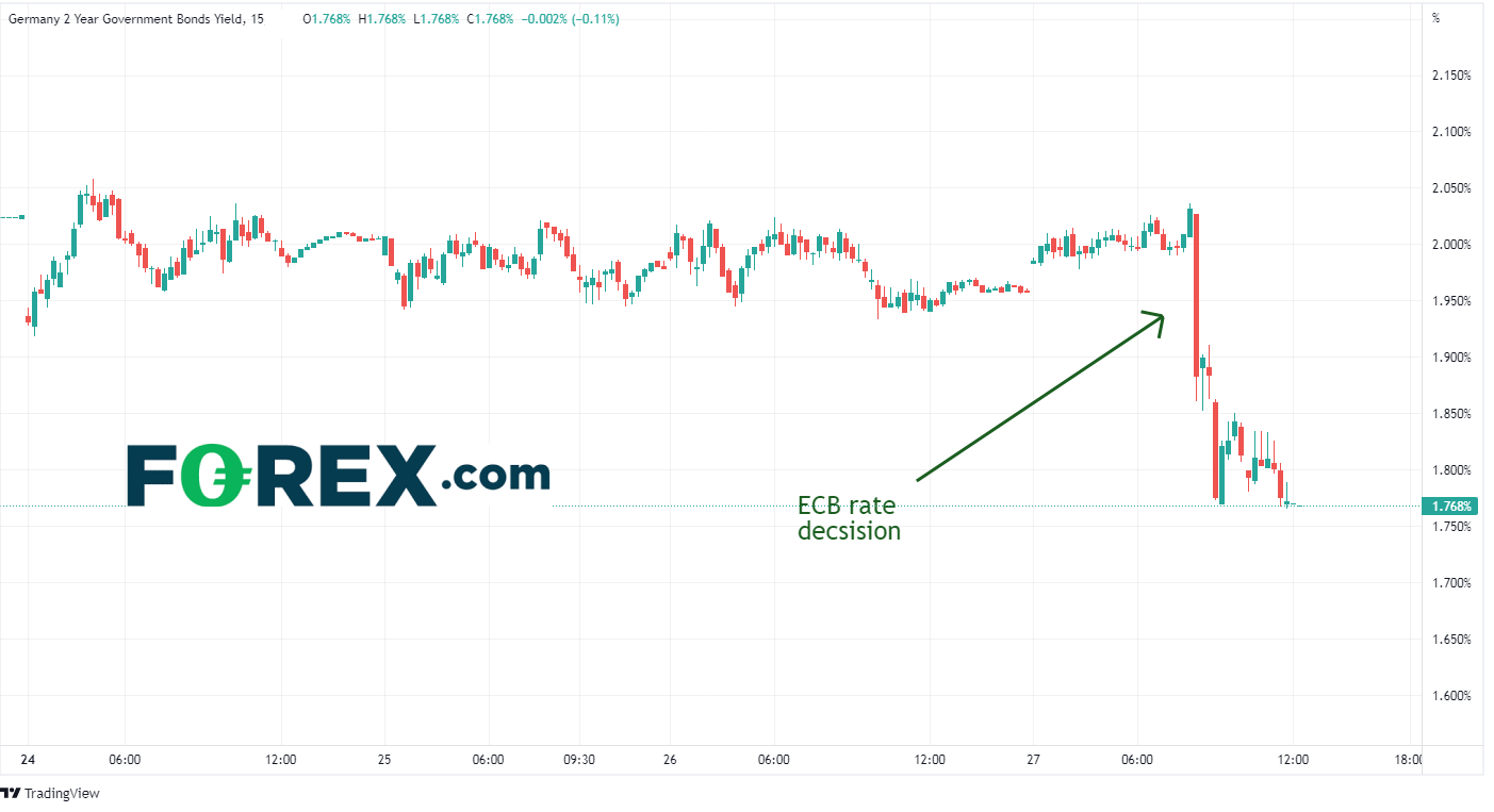 当天受欧洲央行会议和随后的新闻发布会影响最大的是2年期德国国债收益率,从当天2.036%的高位下跌近10%1.768%
