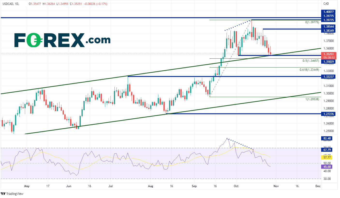 美元/加元在10月13日创下近期高点1.3978,随后美元贬值,货币对交投价随之狂泻。今日数据好坏参半,难以提振美元/加元,经济走弱和高通胀信号令美元进一步承压。该货币对目前在1.3502附近交投,为10月4日低点形成的支撑位与9月21日以来长期上行通道上轨汇合处。