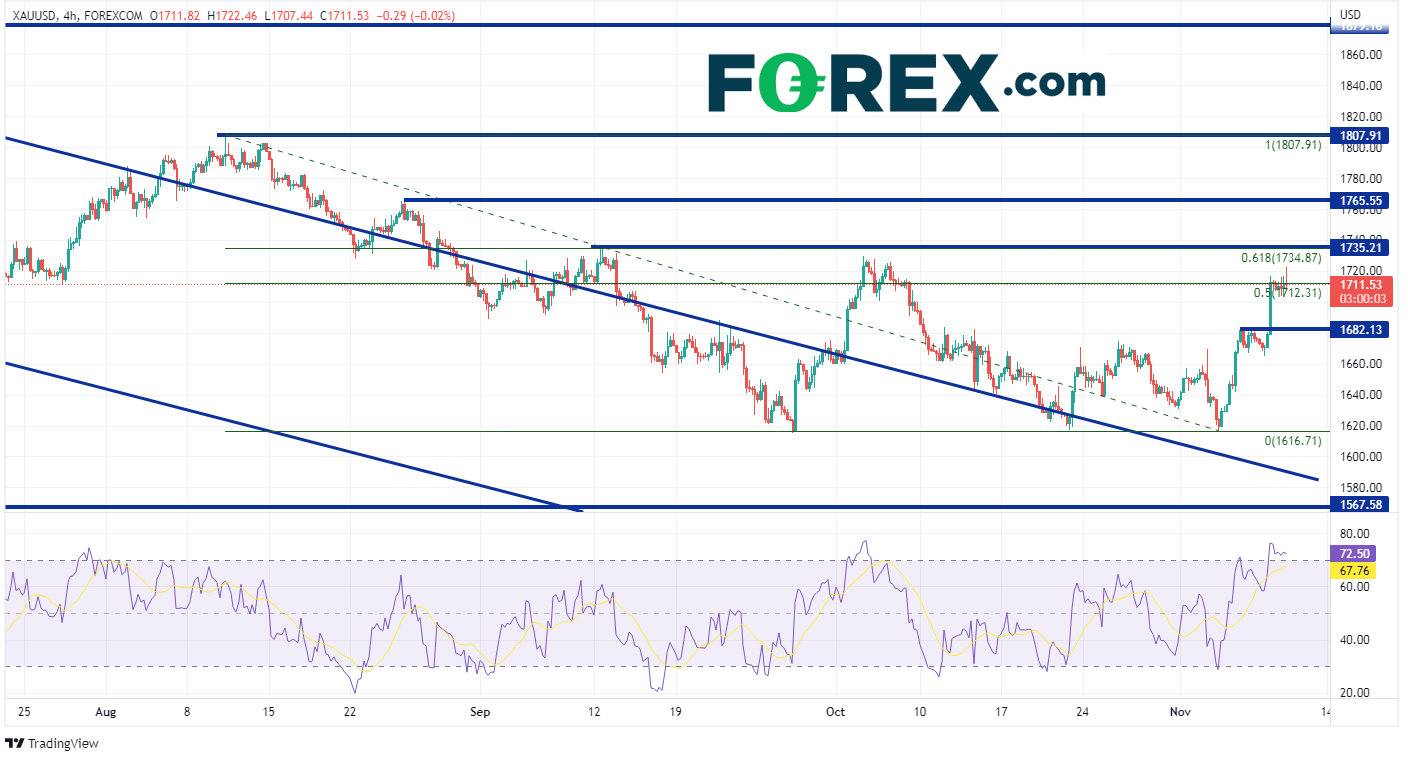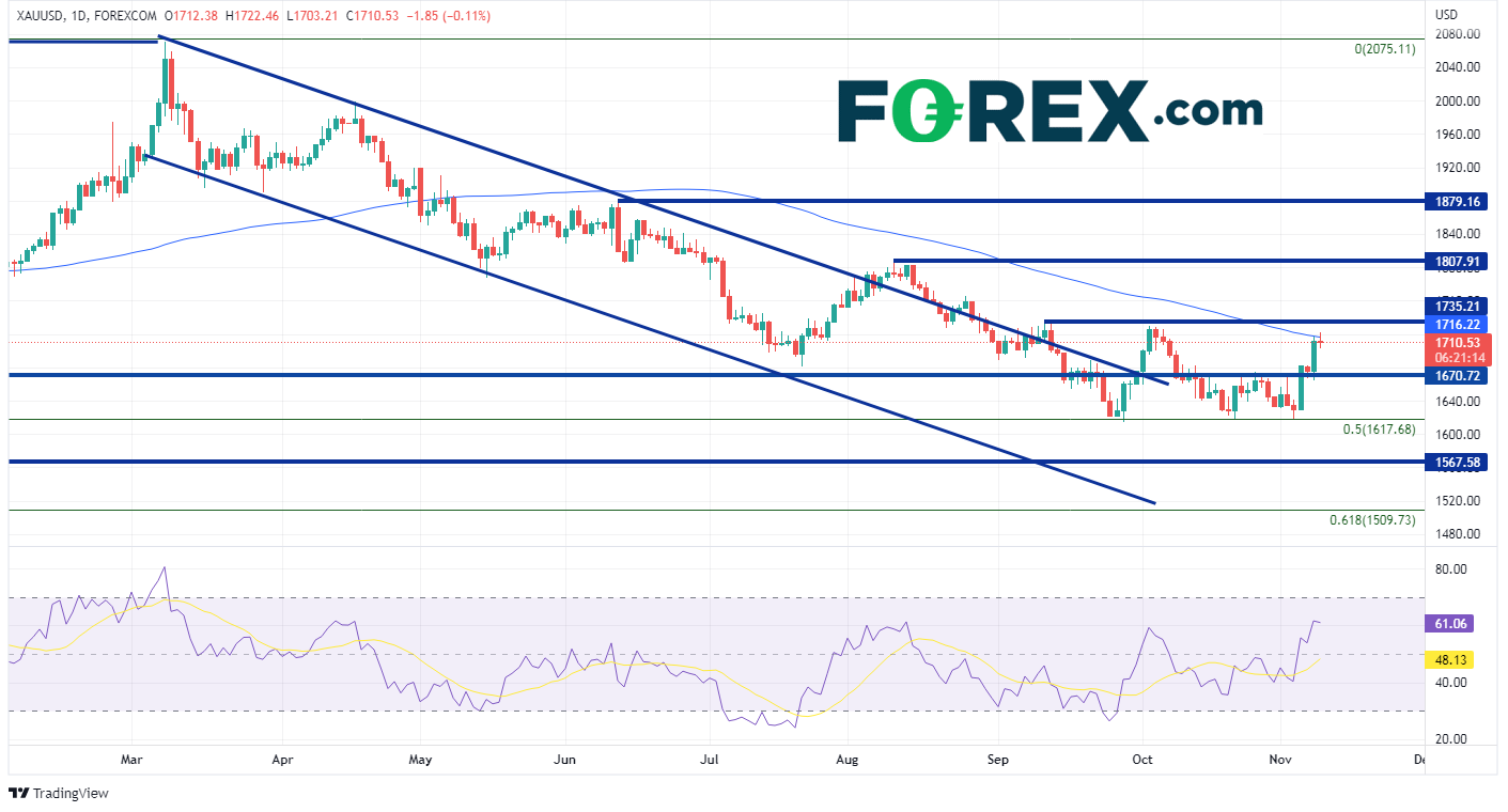 20208月考验历史高点2075.11后,黄金自今年3月以来一直在通道中稳步走低,跌至20188月低点到20208月高点区间的50%回撤位1617.68附近。自928日以来,黄金曾三次尝试突破该支撑位,但均以失败告终。最近一次对该支撑位的考验发生在113日星期四,即美元发生暴跌的前一天。自那以后,黄金上涨了近100美元,现在正考验100日均线1716.21点位。